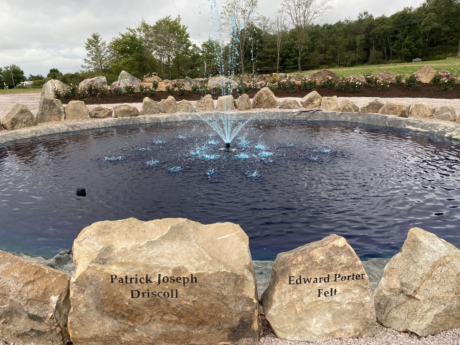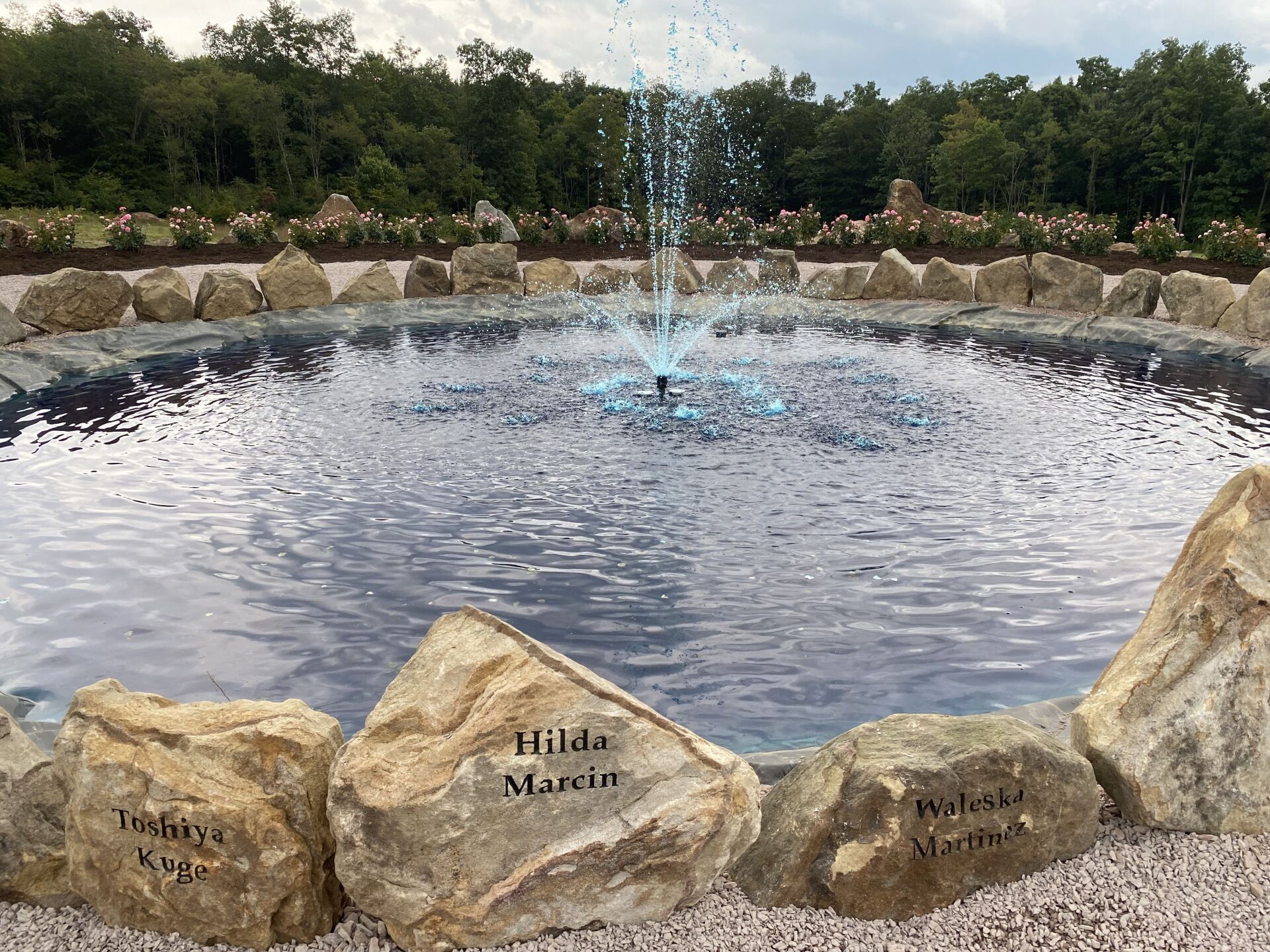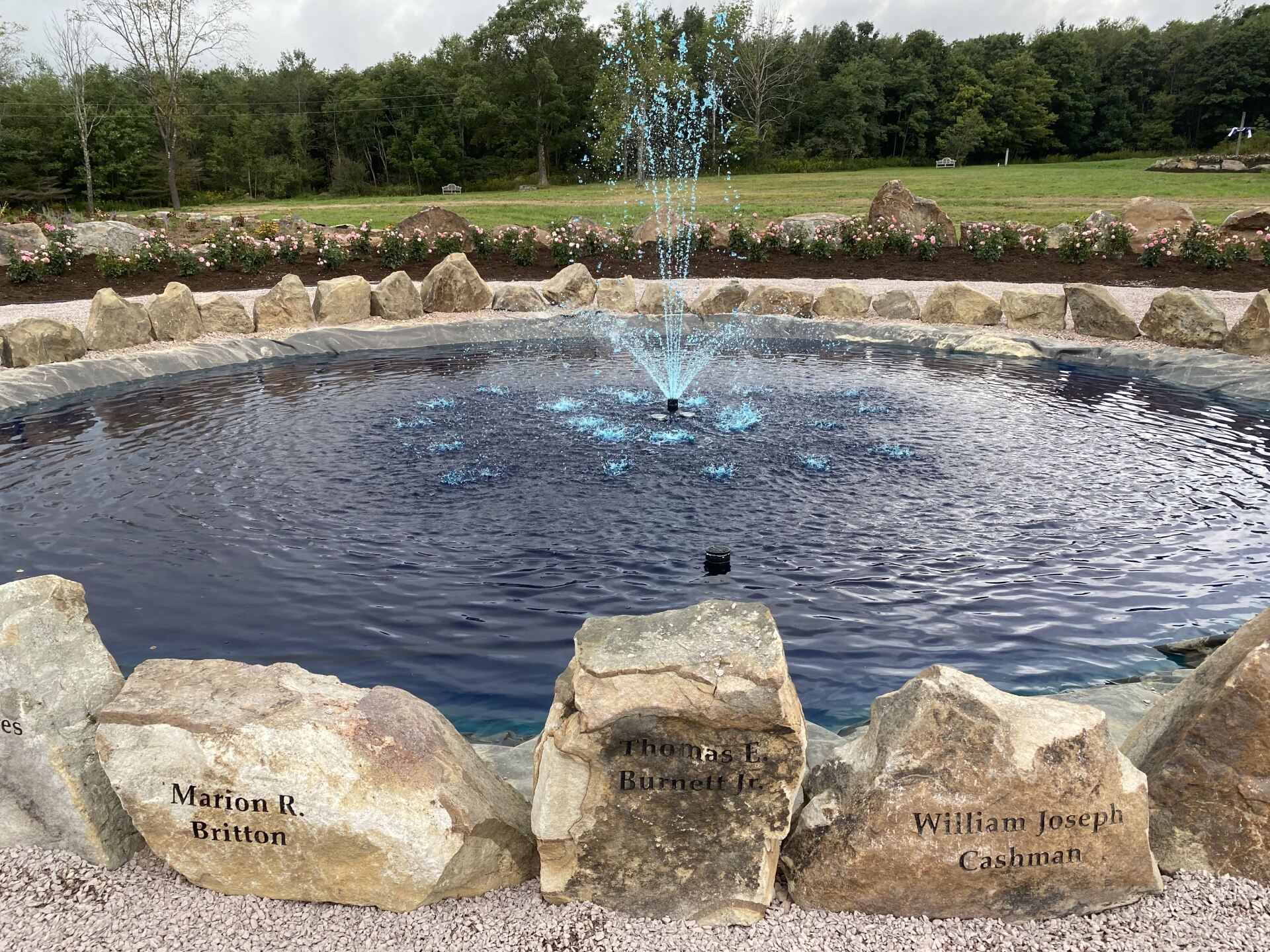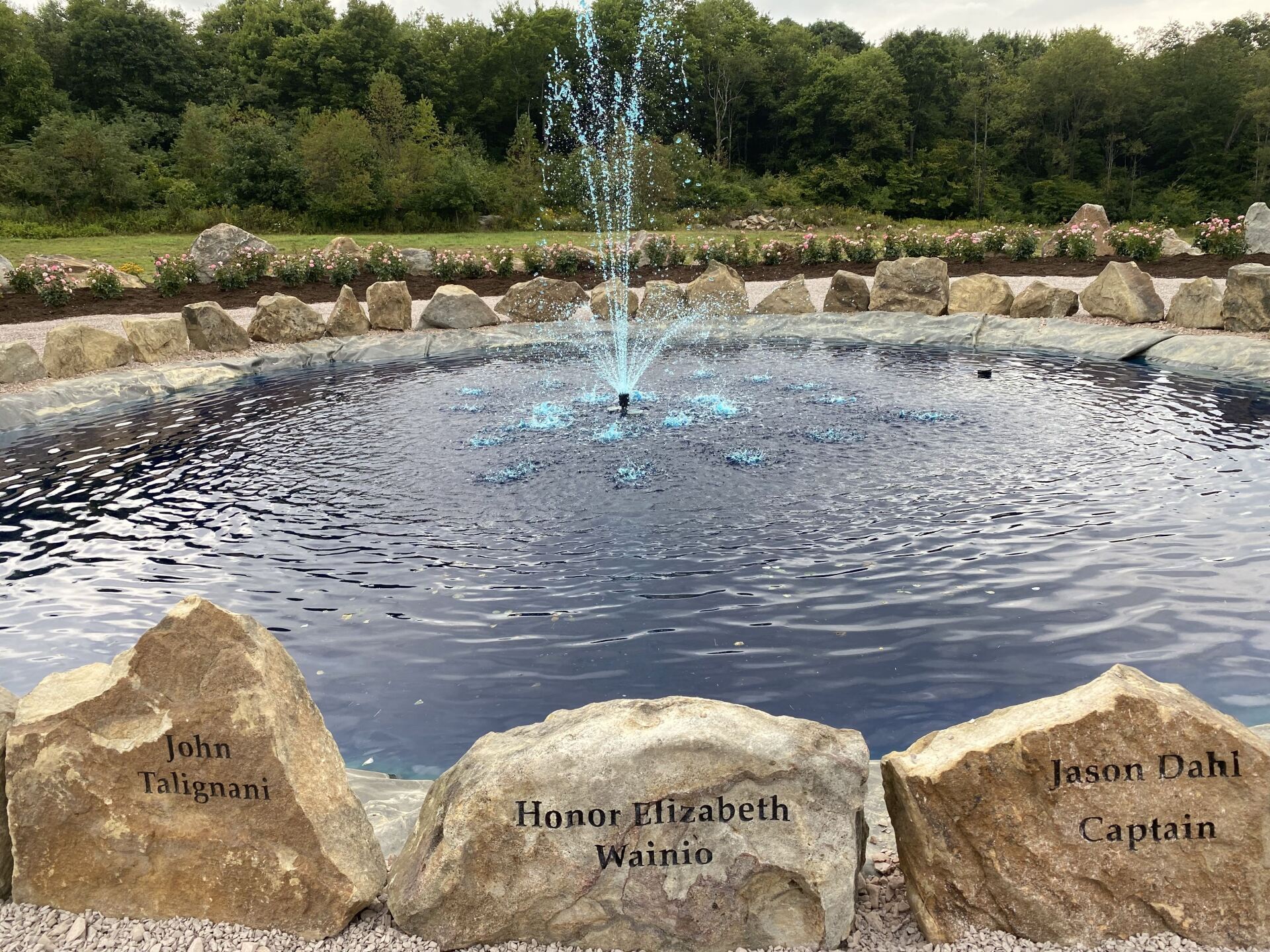 The names of the 40 heroes are engraved on the rocks surrounding the fountain in the center of the Remember Me Rose Garden. May we “Never Forget” them and their spirit of unity, faith, courage, and conviction in the face of extraordinarily desperate circumstances. They are true heroes!!